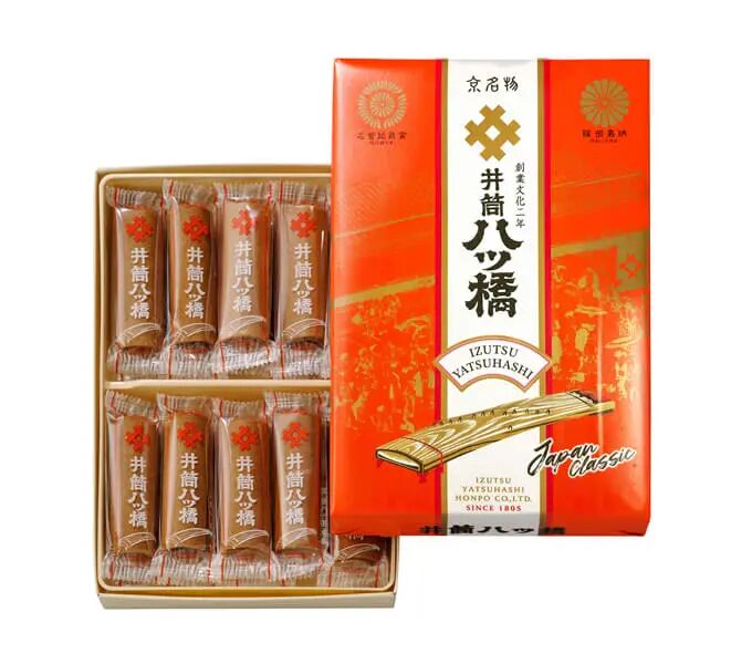 作為京都最具代表性的伴手禮之一,井筒八橋餅源自日本箏曲之祖——八橋檢校。這款以肉桂香氣為特色的硬質煎餅,酥脆的口感,帶有肉桂的清香。長方形的造型,一說仿自日本箏的優雅輪廓,另一說源於橋的意象,頗具文化韻味。
