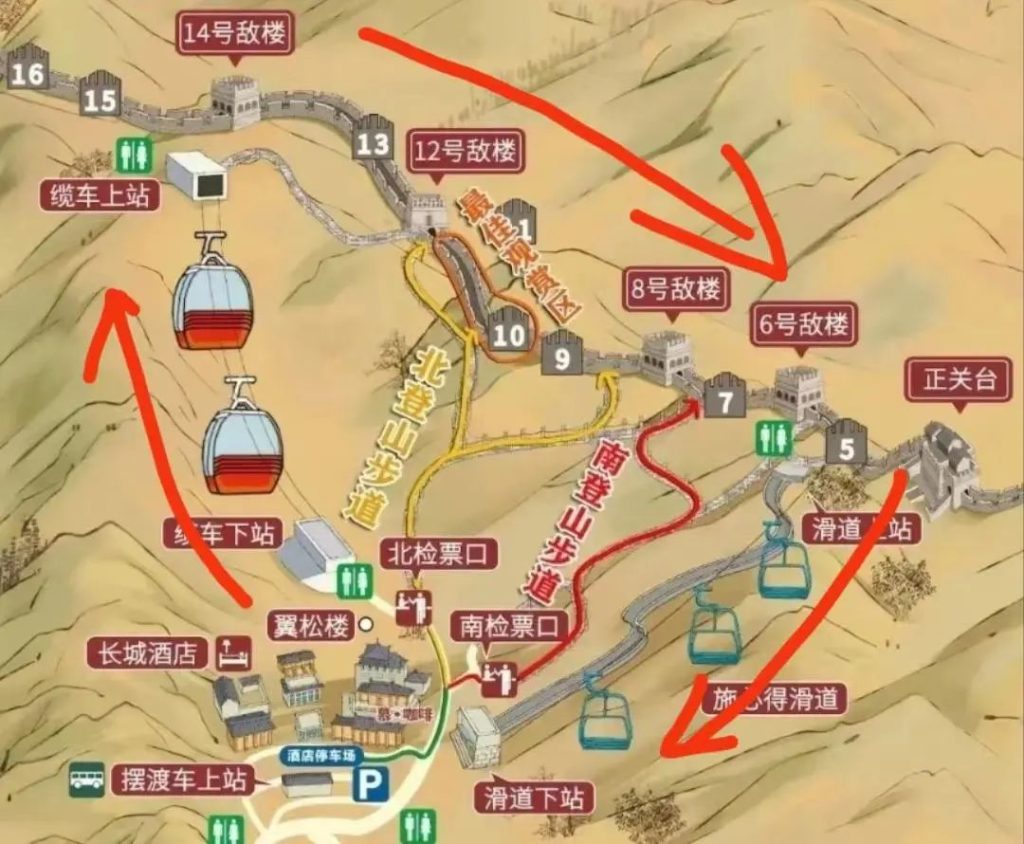 行走路線:14號敵樓(坐纜車)—6號敵樓(坐索道下或滑道下)。