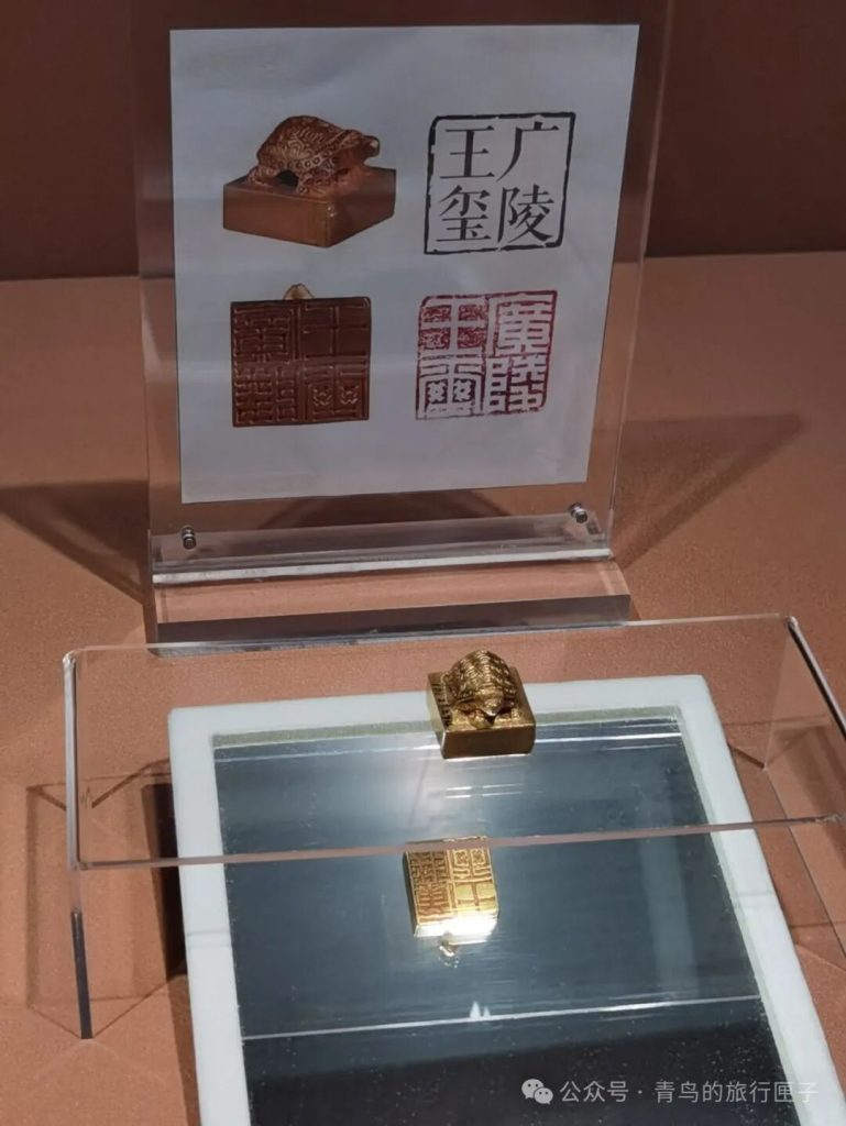 權信之寶:廣陵王璽金印。廣陵王即東漢光武帝劉秀的第九個兒子劉荊,此印材質為質高純度黃金,總重量達122.87克。乃全國考古發現的唯一一枚漢朝劉姓王金印,與滇王之印和倭奴王印為姊妹印,具有極高的曆史和藝術價值。