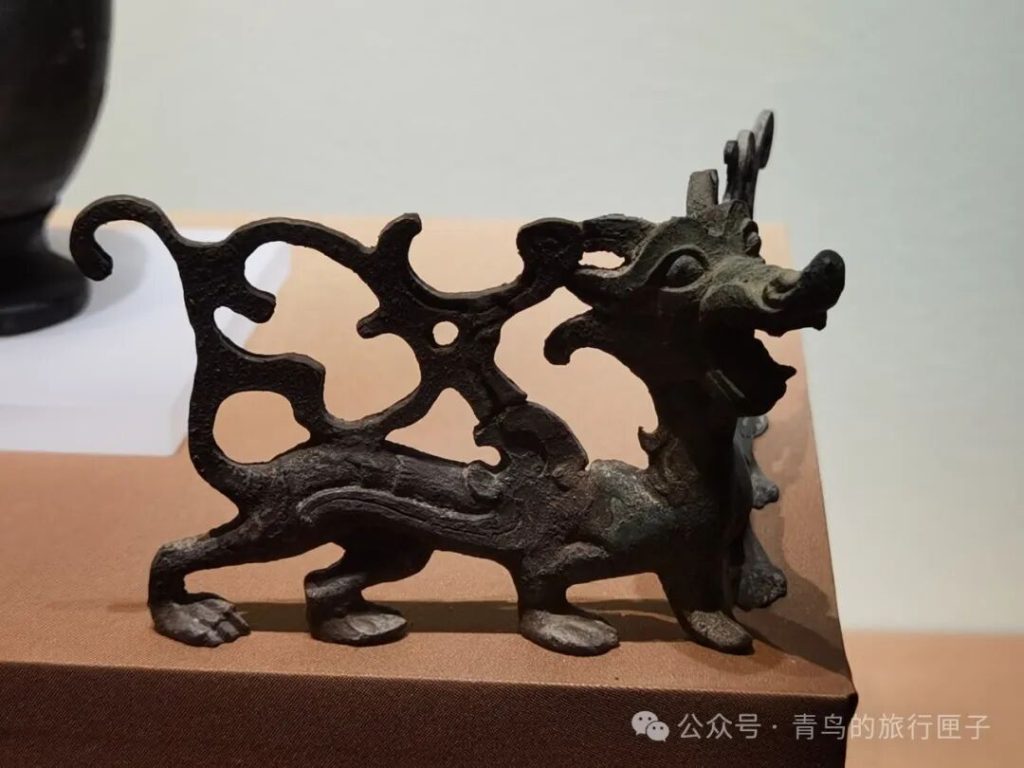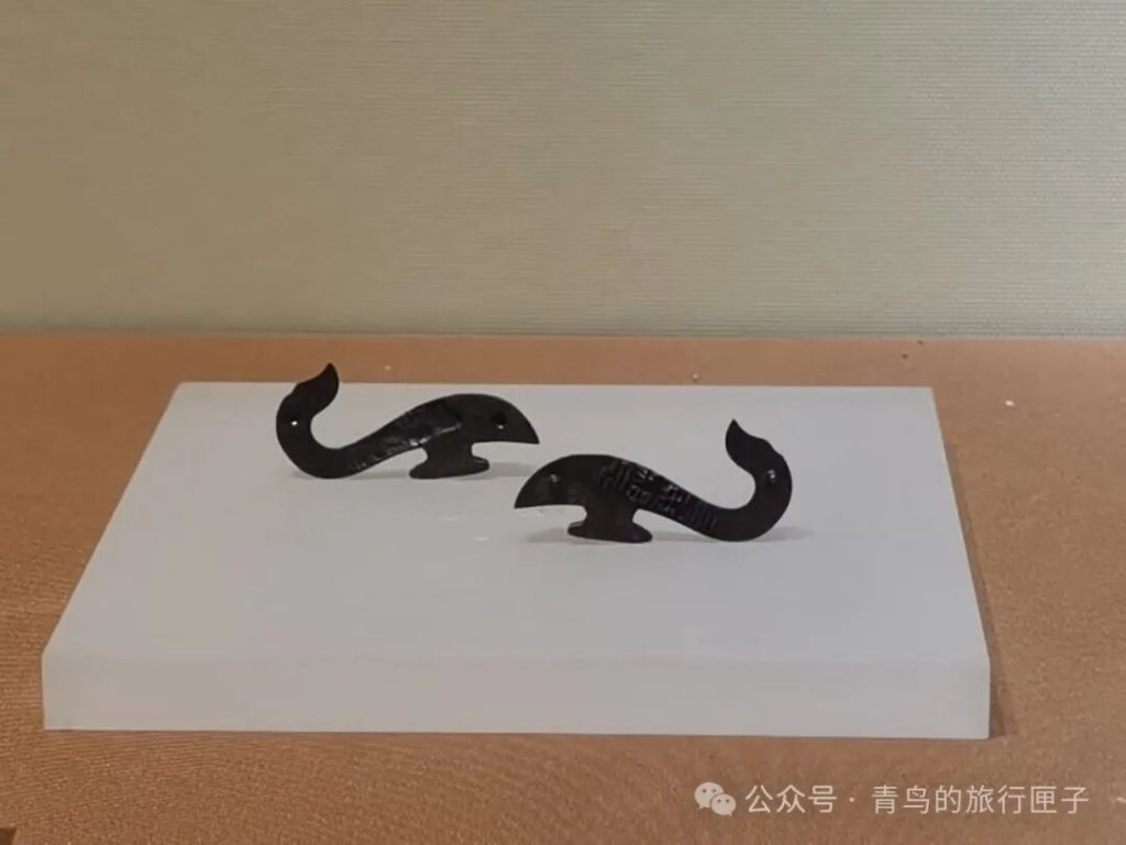 “長毋相忘”銘合符銀帶鉤,西漢中期。帶鉤主要用於束帶,是漢代人生活的必需品,這件精致小巧的銀帶鉤出自江都王一位寵妃的墓葬中,鉤身內面鑄有吉祥語“長毋相忘”,意為:“時常想念,切勿忘懷”,言近旨遠,情意綿綿。