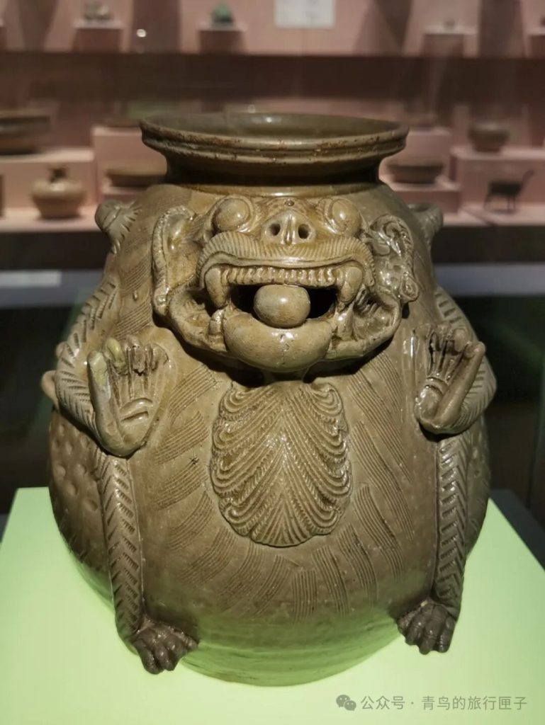 神異之寶:青釉瓷神獸尊,西晉,1976 年出土於宜興周處家族墓周墓墩中。此青瓷神獸尊體量大,神獸的神態驚人,全身刻滿紋飾,造型獨特而又具有西晉瓷器的典型特征,是我國最早有銘款的瓷器之一。