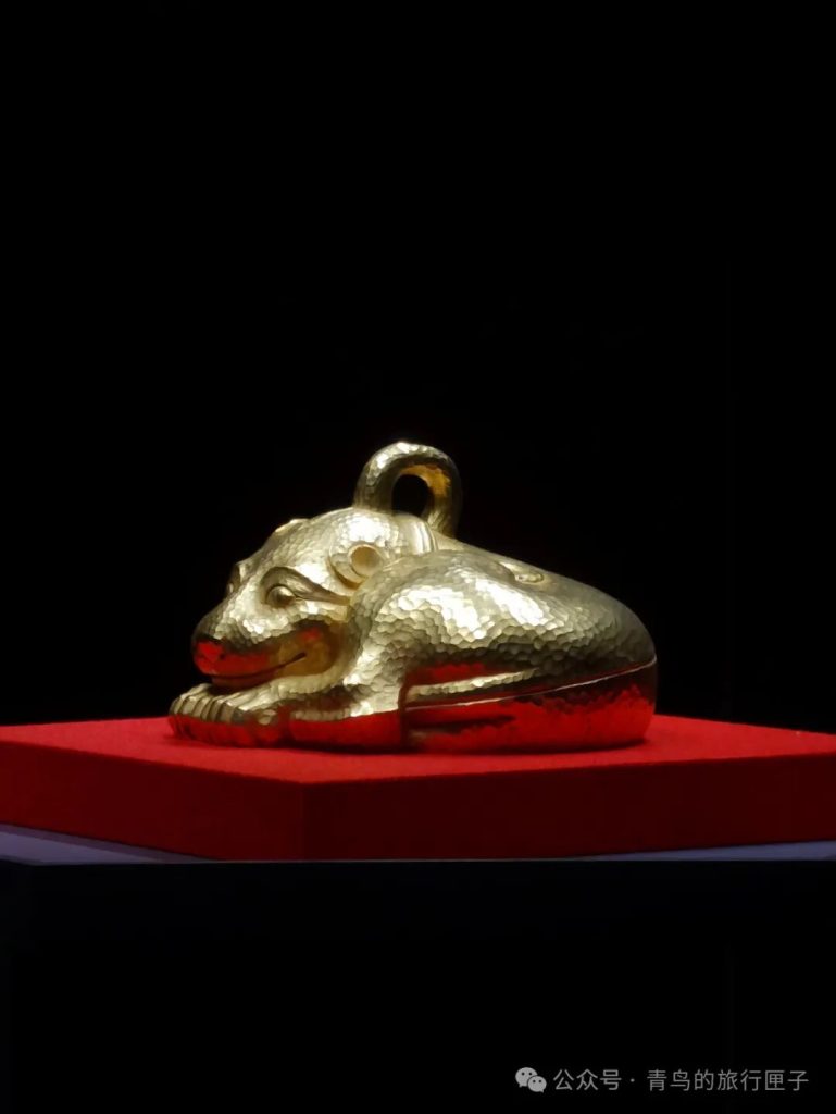 金獸,1982年出土於江蘇省盱眙縣南窯莊窖藏。長17.5厘米、寬16厘米、高10.2厘米,最晚可追溯至西漢。整體造型屈腰團身,神態警覺,頸部有項圈三道,上有環鈕。空腹厚壁,澆鑄成形,通體錘飾圓形斑紋。腹內部刻有"黃六"二字。含金量99%,重9100克,是目前我國出土古代黃金鑄器中最重的一件,被稱為"鎮護之寶"。