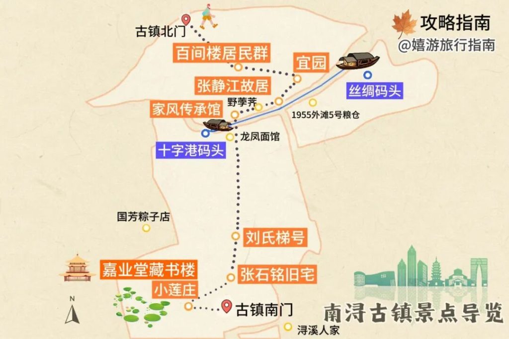 古鎮南門—小蓮莊—嘉業堂藏書樓—張石銘舊宅—劉氏梯號—南潯家風傳承館—張靜江故居—宜園—百間樓居民群—古鎮北門