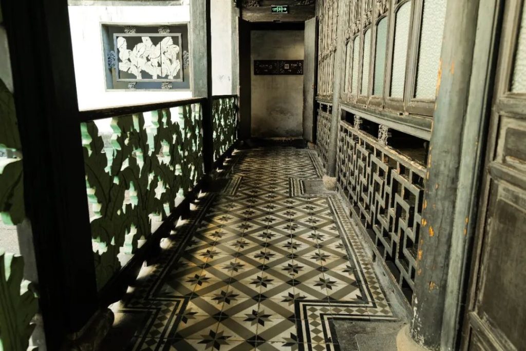 牆上嵌有硬木的漏明窗,扶欄門框雕刻有芭蕉葉圖案,走廊地板上還鋪著西洋風格的瓷磚。