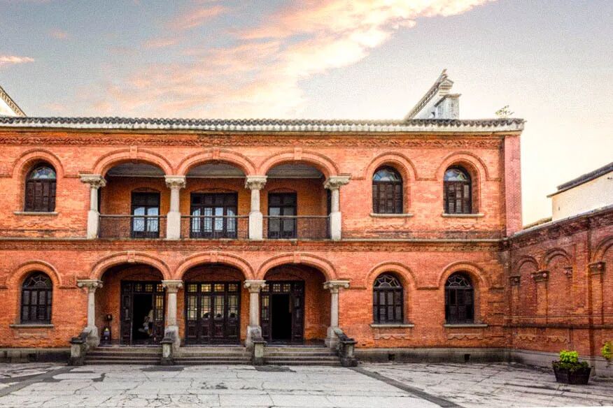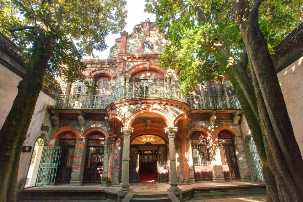 梯號裏最引人注目的就是這棟紅房子了,建築主體布局以傳統廳堂結構為基礎,融入了西方的羅馬風格,兩側還立有馬頭牆。後院則是中式的園林,遍植草木,有迂回曲折的長廊和月牙形的潭池。