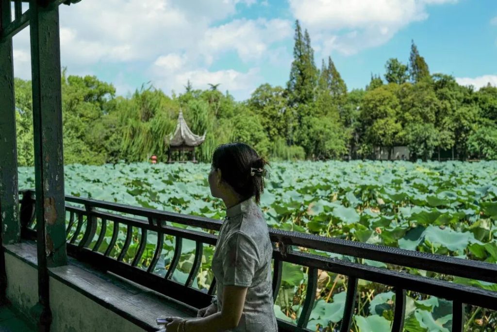 小蓮莊分外園和內園,外園主體是占地十來畝的荷花池,這個時節荷葉依舊碧綠;池塘周圍圍繞著逶迤的中式長廊和閣台樓閣。