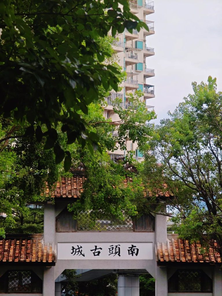 從牌坊走進去,穿過南門公園(一片綠地)就到了南城門了,城門很古樸,一看就很有年代感和曆史的滄桑感,屬於在深圳比較不多見的景致。“嶺南重鎮”四個字,瞬間就把時間拉回到了古時候,城門口的熙熙攘攘似乎浮現在眼前。