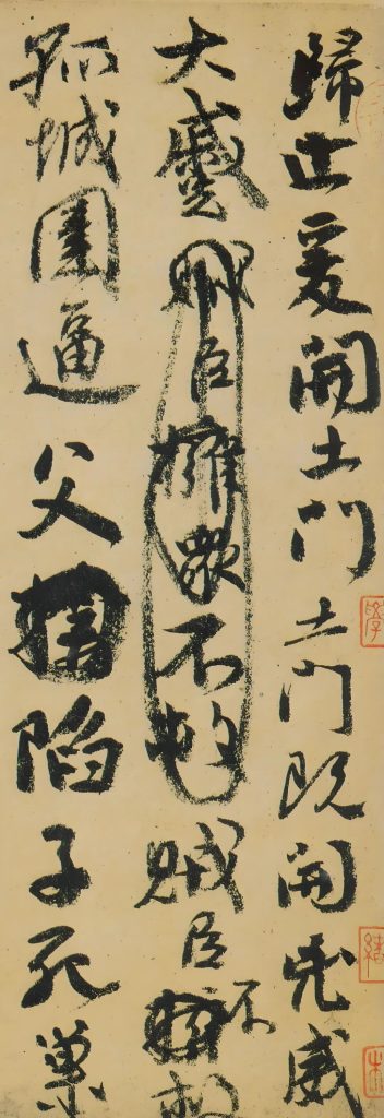 北宋蘇軾的墨跡素箋本,被稱作 “天下第三行書”,整篇在字形大小和疏密變化上有許多巧妙的安排,開篇起筆字跡較小,沉穩勁秀,寫到後篇,隨著作者情緒的變化,字行跌宕起伏,大小錯落,氣勢恢弘,具有極強的視覺沖擊力。