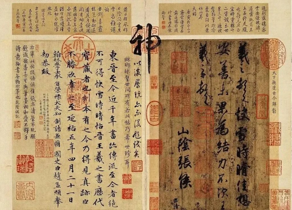 東晉王羲之的書法作品,唐摹本。該帖受到曆代書法家和收藏家的高度贊譽,趙孟頫甚至贊其為 “天下第一法書”。乾隆皇帝珍愛有加,乾隆皇帝在帖上鈐印一百七十七則,題跋七十四則,還繪水墨畫兩幅於此帖的冊頁上。