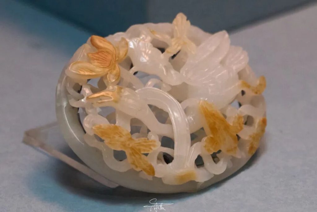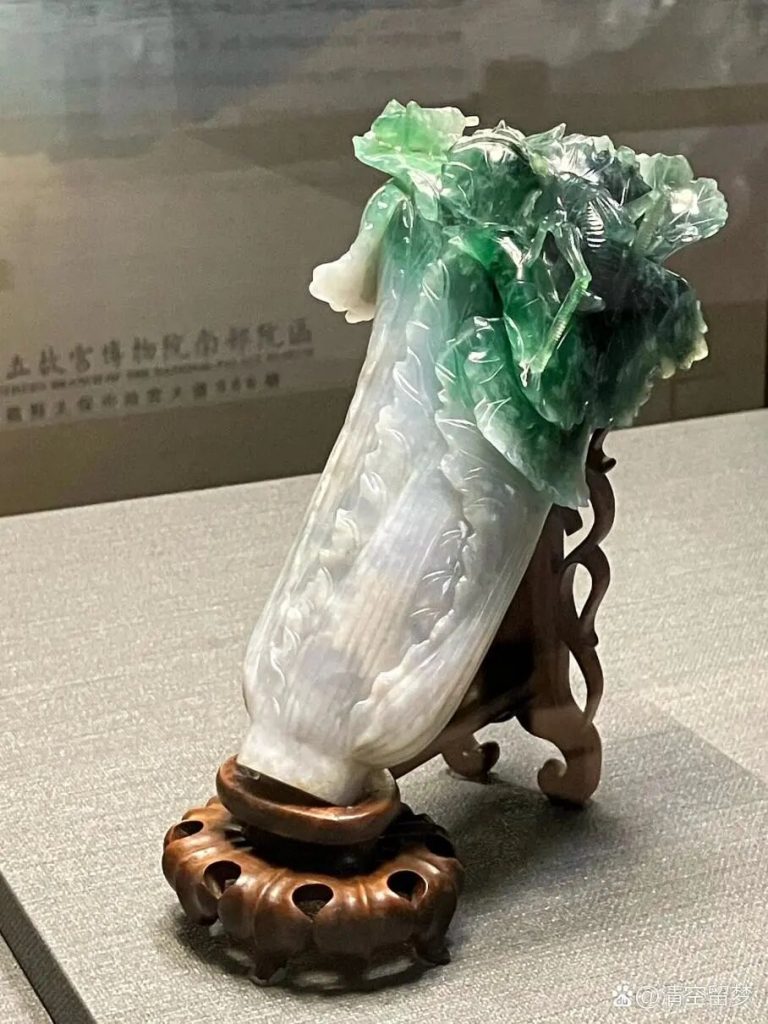 相傳翠玉白菜是光緒皇帝的妃子瑾妃的嫁妝之一。白菜音同 “百財”,寓意財富,白菜上的兩只昆蟲蝗蟲和螽斯,都具有多子多孫的含義。深受民眾的喜愛與關注,在文化、藝術等領域具有極高的價值。