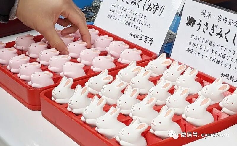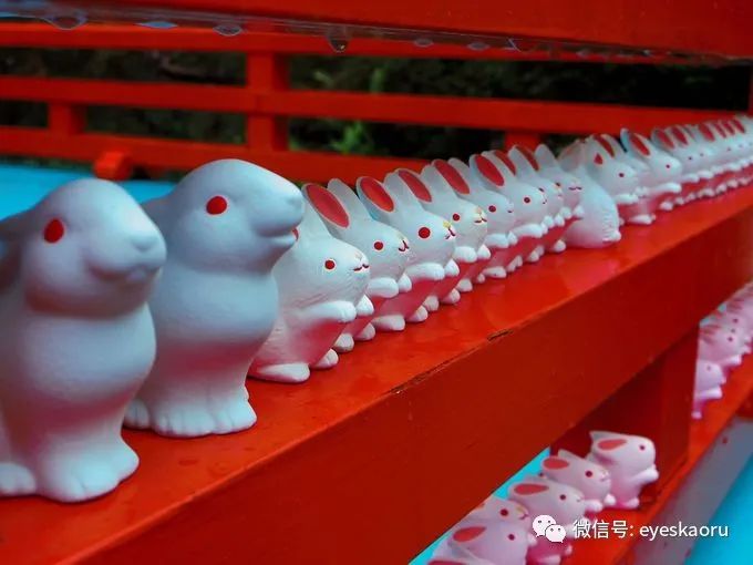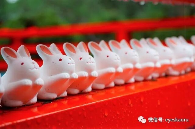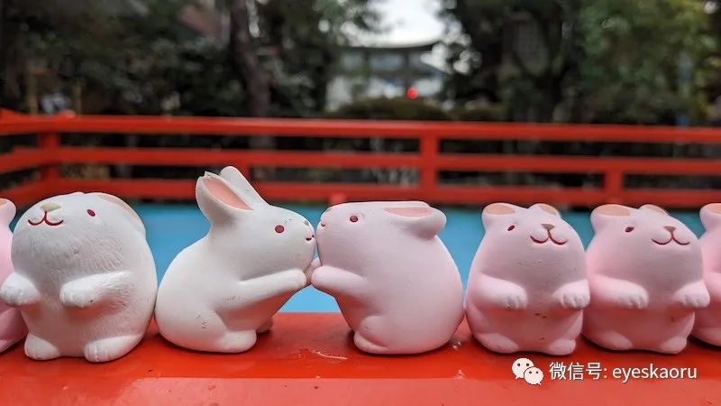 讓“兔子神社”--岡崎神社人氣飆升的是正殿對面可愛的“兔子神簽護身符”擺件組成的兔子行列。白色和粉色的兩種顏色的兔子,微微微笑著坐著的樣子讓喜歡兔子的人欲罷不能。