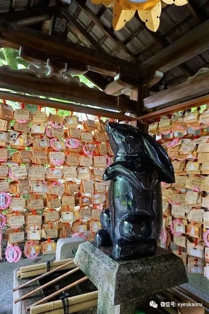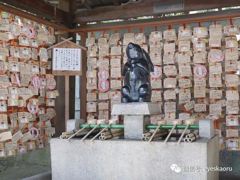 在求子兔的四周,一字排開擺放著參拜者供奉的祈求得子、順產的繪馬和神牌。繪馬上畫的當然是兔子。繪馬的設計有多種,可以選擇自己喜歡的兔子供奉。