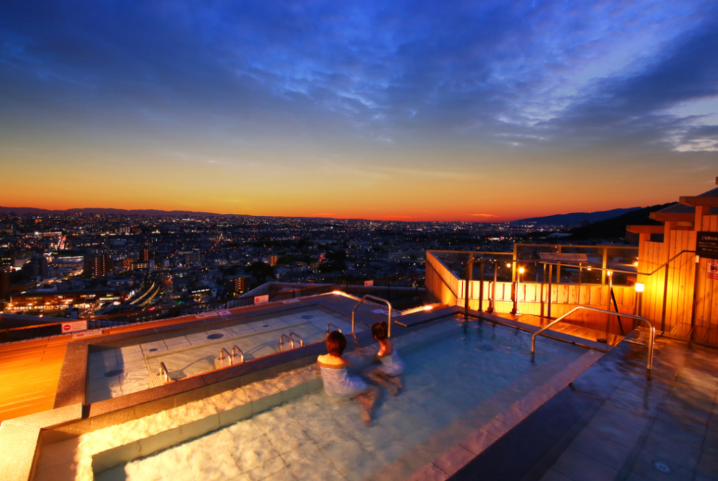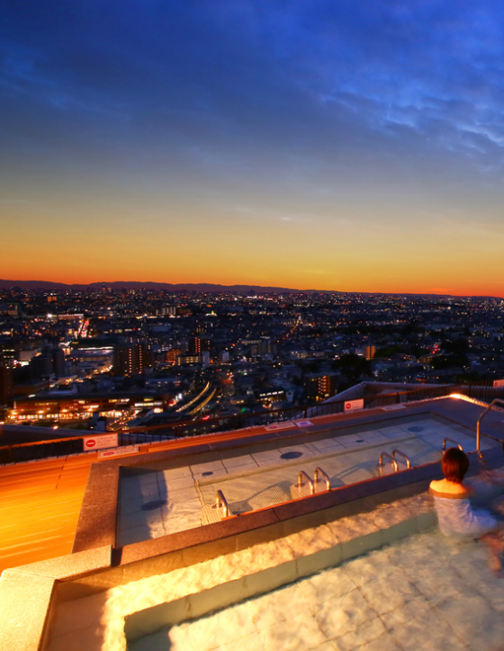 頂樓的天空露天溫泉位於海拔約180米處,可以欣賞到從這裏一覽無餘的大阪平原,以及夜晚沉浸在熱水中的一片1000萬美元的夜景。
