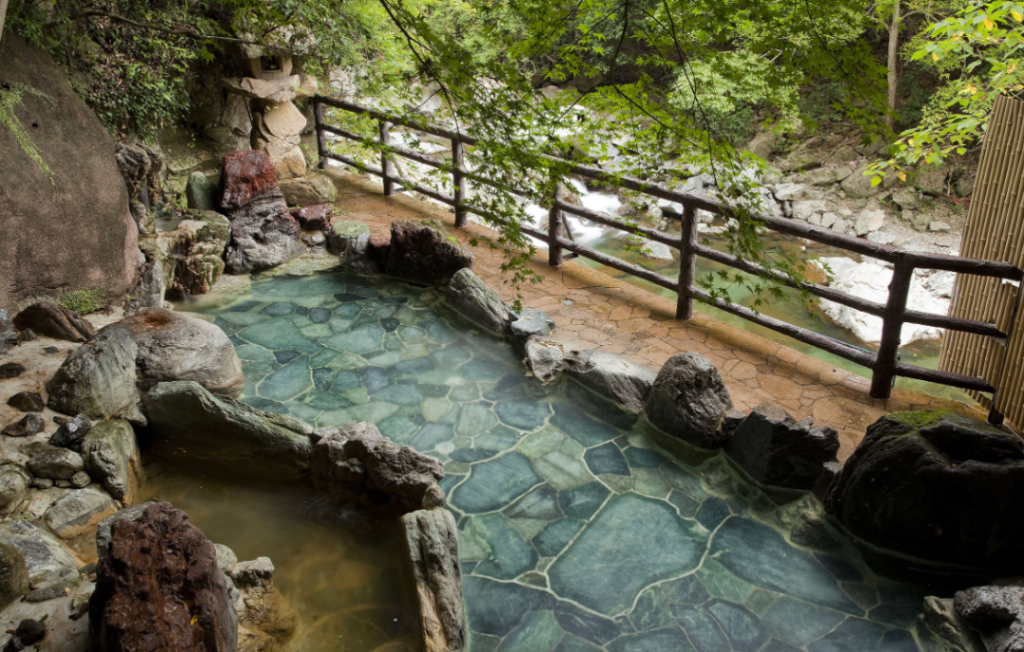 熱水有2種,1號泉含有大量氡的堿性單純泉是內浴的岩浴,2號泉的堿性純小蘇打泉是俯瞰芥川溪穀的露天浴池。特別是2號泉的濃度是標准溫泉標准的2.5倍,對美肌膚,療養泉的功效很高。