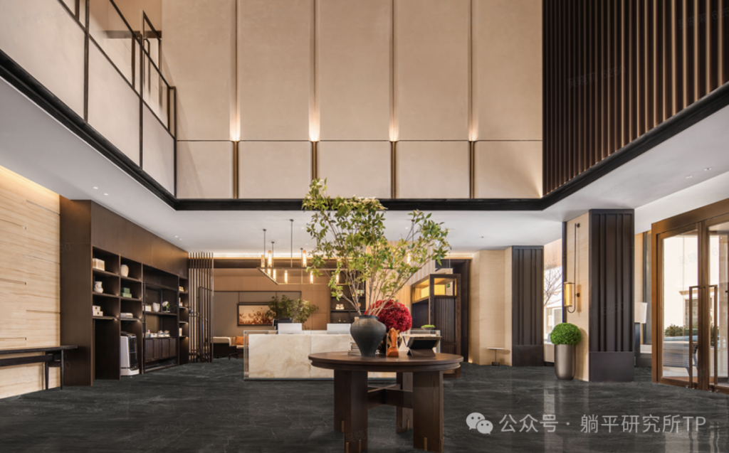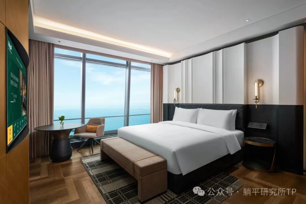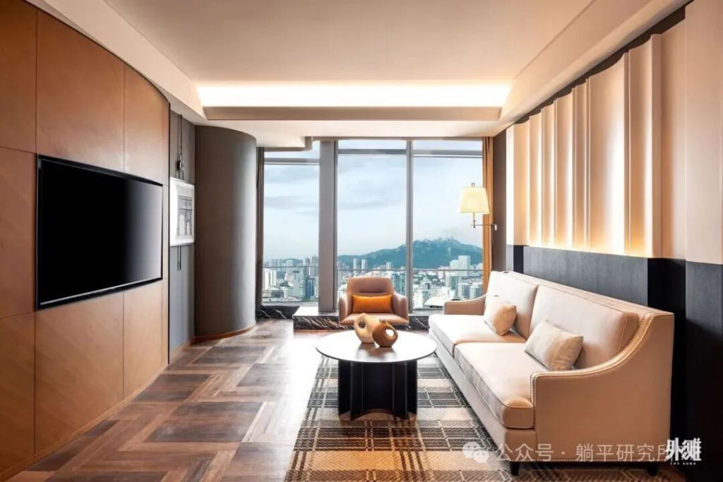 包豪斯風格的家具、黑白條紋地毯、圓弧形電視牆與波浪紋裝飾,在嚴謹中透出柔美,闊綽的衣帽間與質地柔軟的浴袍,無一不踐行著“新奢”哲學——減去多餘的奢華,保留必須的高級。