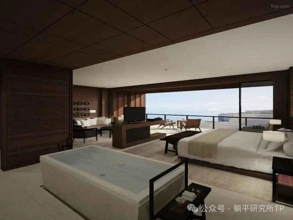 酒店共有161間全海景套房,每間約100平方米,配備9米落地窗與私人陽台。無論是在床上、浴缸中,還是陽台的躺椅上,遼闊海景都觸手可及。細節之處,如檜木的溫潤質感與治愈系浴鹽,皆讓人感受到:真正的奢華,是一種可觸摸的細膩生活。