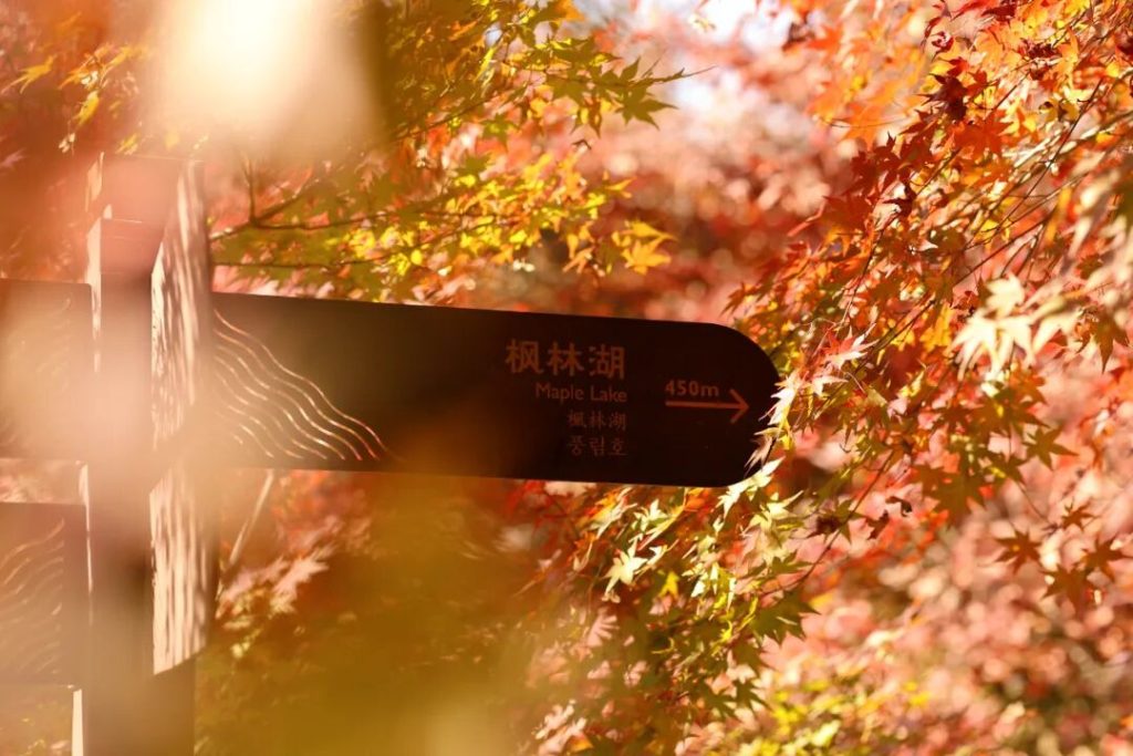 而秋日的明鏡湖則被紅葉環繞,清晨湖面上薄霧朦朧,彩虹橋倒影與紅楓相映。