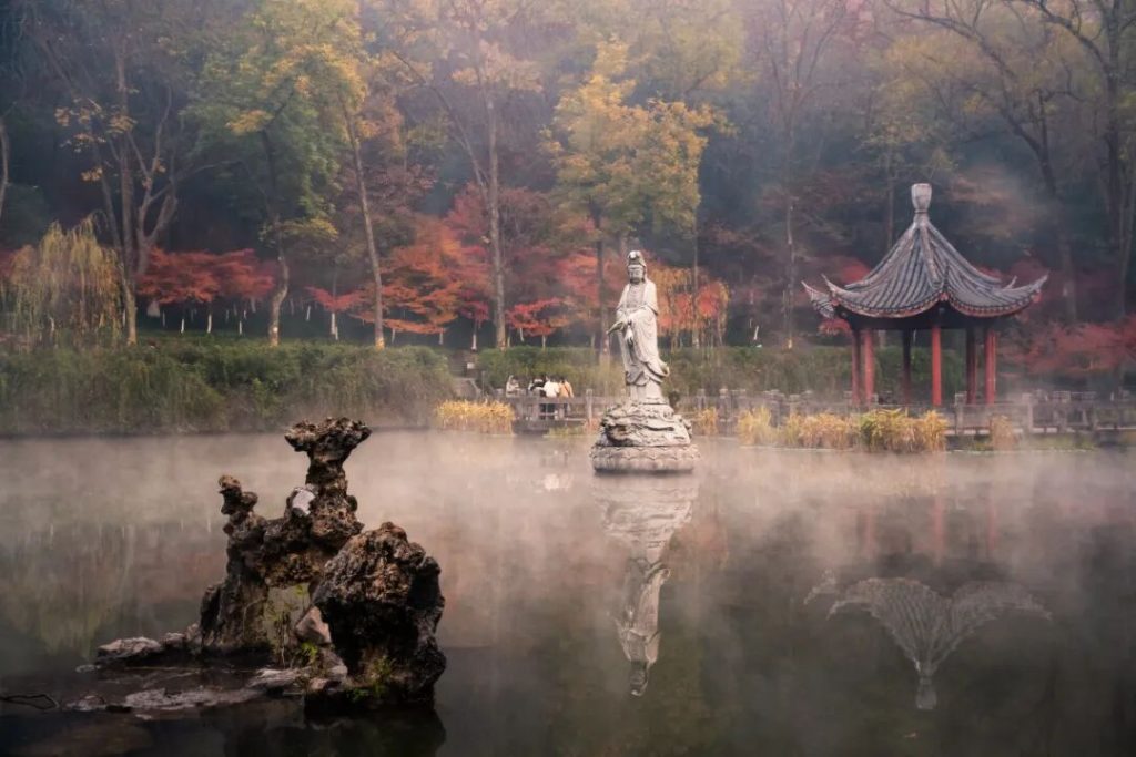 進門入眼便是“湖映紅楓”的治愈系秘境,棲霞古寺內百年古銀杏的金黃在一片紅葉林中格外亮眼,隨著鍾聲漸響,禪意與秋韻交織,原本寂寥的秋日在此刻變得寧靜明媚起來。