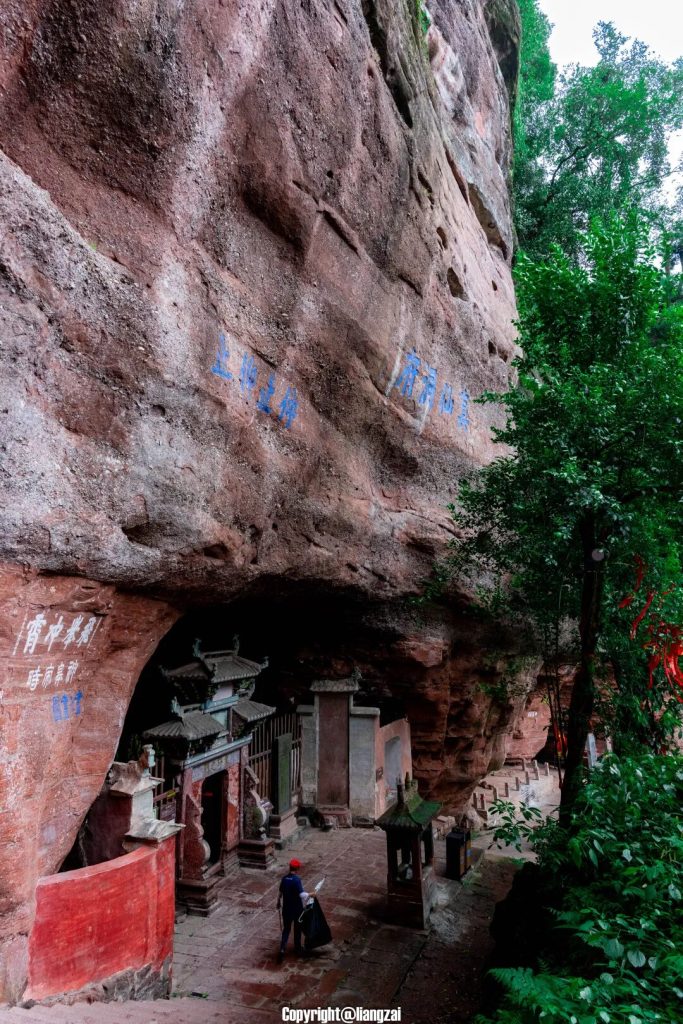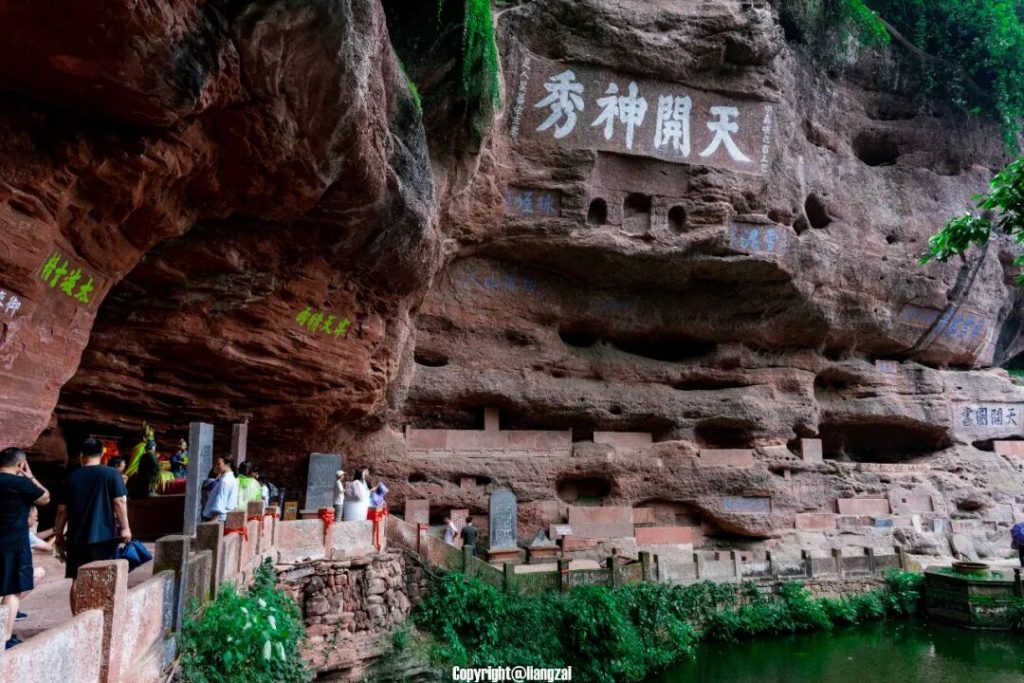 穿過一天門,豁然開朗,對面山體崖壁上“天開神秀”四個大字映入眼簾。這裏危崖三彎折,相連如城垣,岩下通道有砌石欄杆,欄外為碧蓮池,崖間有各種洞建宮宇,供奉道教各路神仙,統稱真仙洞府,洞窟崖壁上滿是摩崖題字石刻。