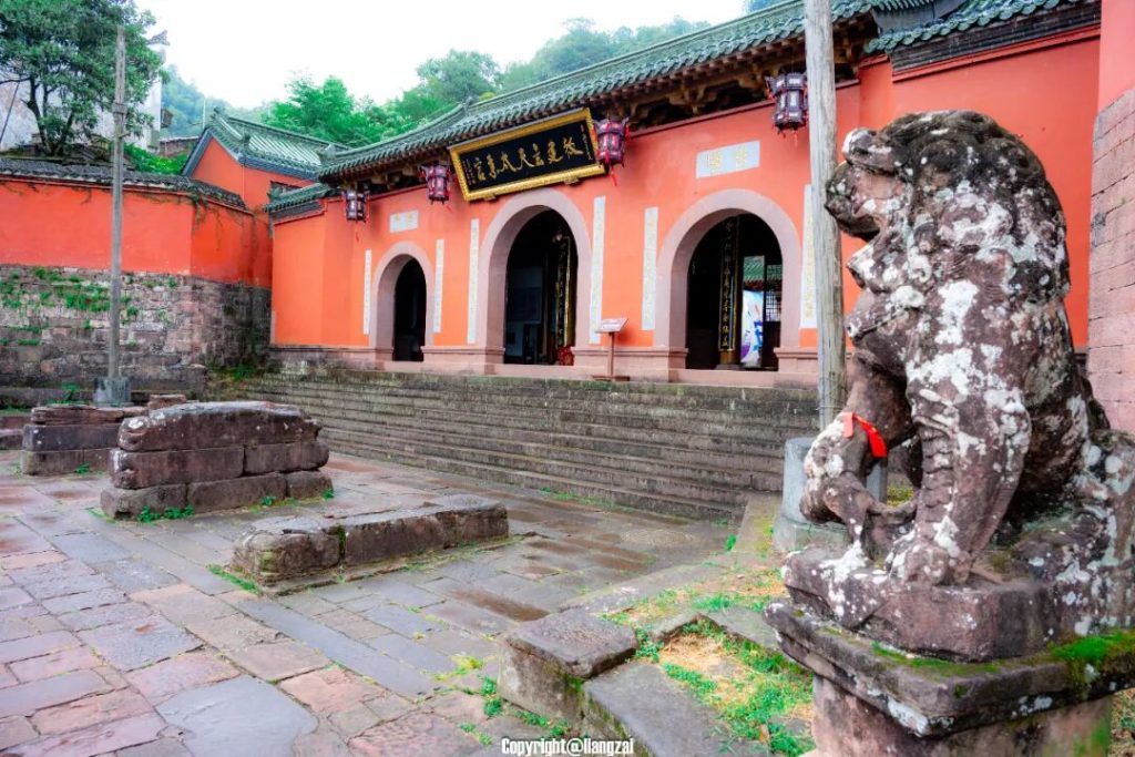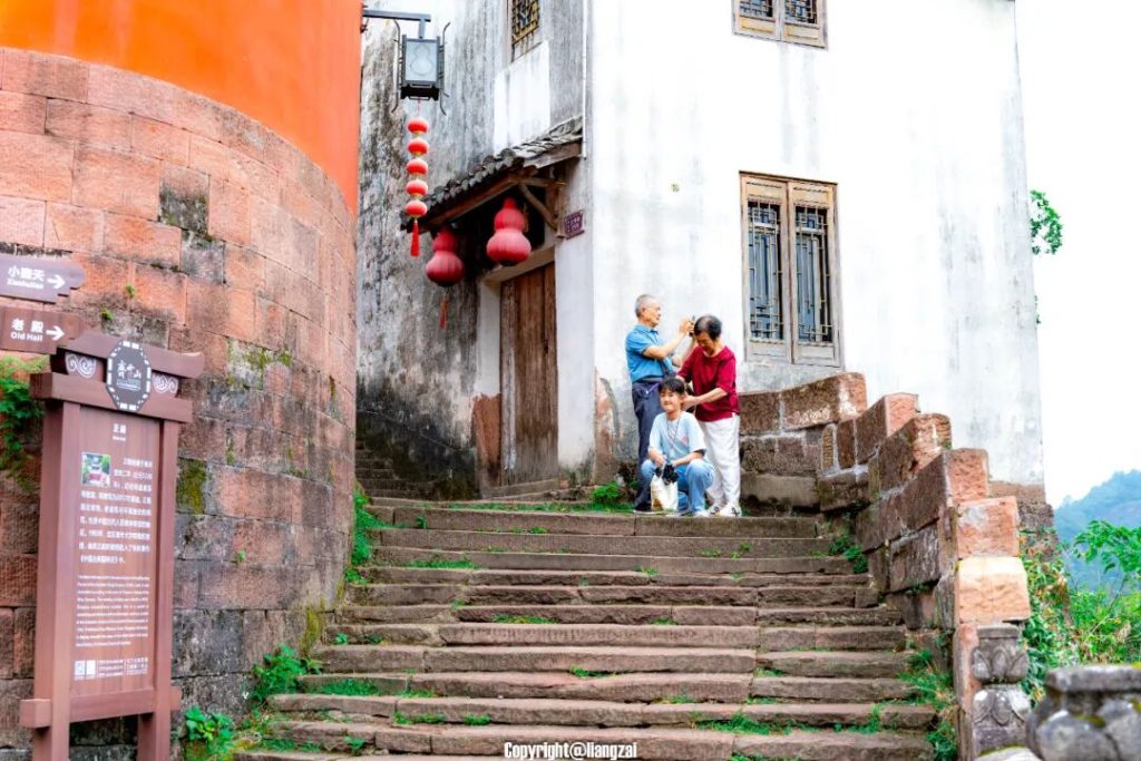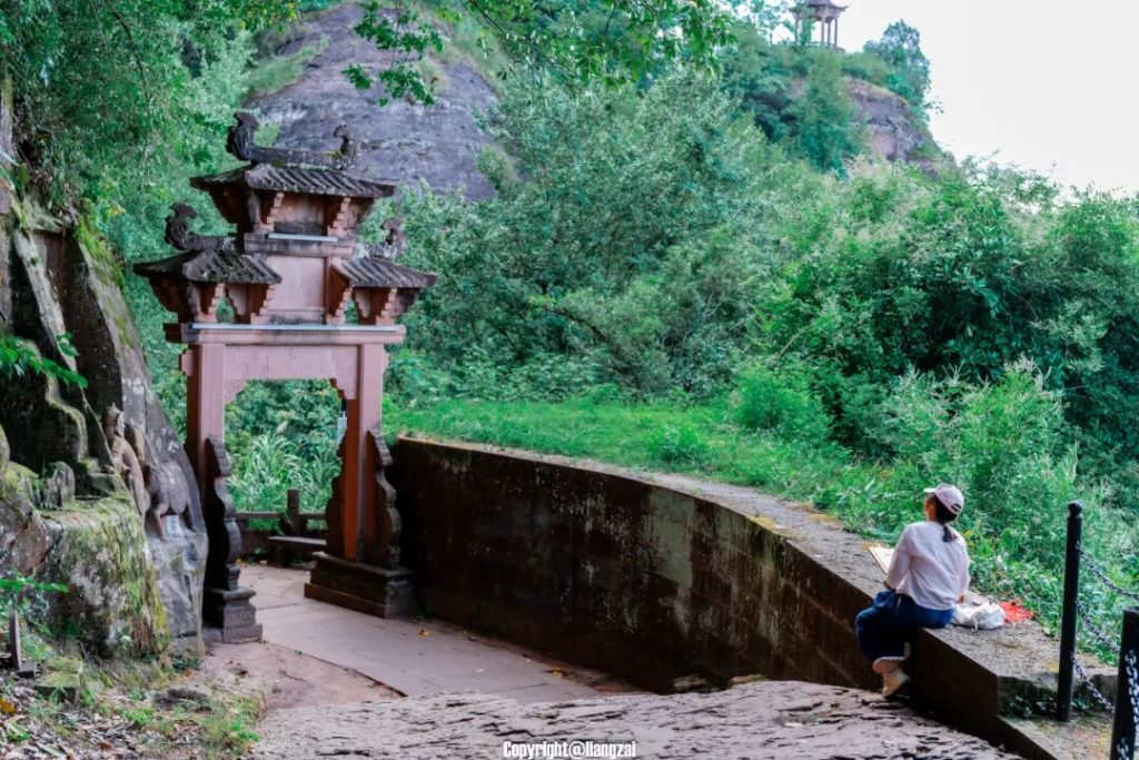 從小壺天出來,我們先入住位於天街街尾的客棧。辦完手續,時間尚早,於是我又帶上小兒子沿山道繼續往上攀爬。沒走多遠,就來到了玉虛宮,據說這裏曾是齊雲山最大的宮殿之一。整個殿宇依山而建,古樸典雅,朱紅的牆體與丹霞地貌的山體完美地融合在一起。宮邊有一池塘,傳來一陣陣的蛙鳴,小兒子好奇地尋找,發現池塘裏的青蛙比普通青蛙要大上一號,鳴叫的時候嘴巴鼓起來,一張一合,像極了電影《功夫》裏的蛤蟆功,看來藝術確實來源於生活。