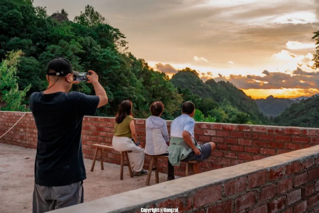 回到客棧,老板說往前有個小平台也可看日落。恰逢太陽下山,落日在雲朵裏時隱時現,幾位遊客搬來長凳慢慢欣賞,此刻時間仿佛都靜止了。