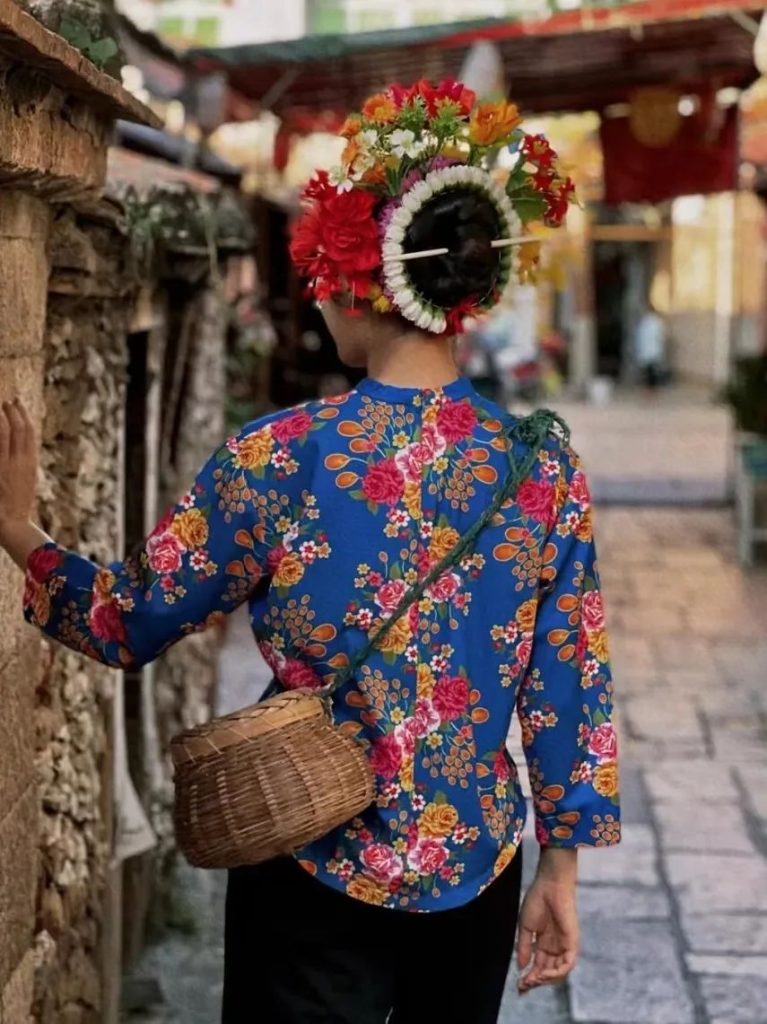愛戴花是“蟳埔阿姨”的天性,從兒時梳辮子起,她們就喜歡把色彩鮮豔的菊花、玉蘭花、山茶花插滿雙鬢,待到及笄(十五歲女孩叫及笄),親人就要為她們“梳髻”。從此,把秀發盤在腦後,梳成圓髻,上金銀首飾,中間橫插一根象牙筷子。