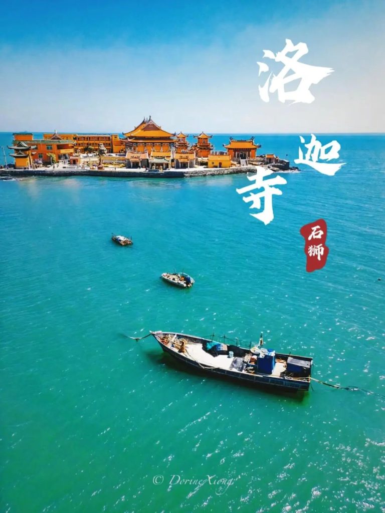 洛伽寺內建有“天王殿”、“圓通寶殿”、“念佛堂”、“藏經閣”、“鍾鼓樓”和“五觀堂”等,整座廟宇巍峨壯觀、雕梁畫棟、金碧輝煌,以海天為背景意境開闊。寺內還有神態各異的十二生肖石雕,各個栩栩如生不由得引人駐足觀摩。站在寺廟內還能直接望向無盡的大海,每個面都能拍到海天一線,亭台樓閣與煙波浩渺、孤帆遠影奇幻交織構成一幅奇絕的風景畫。