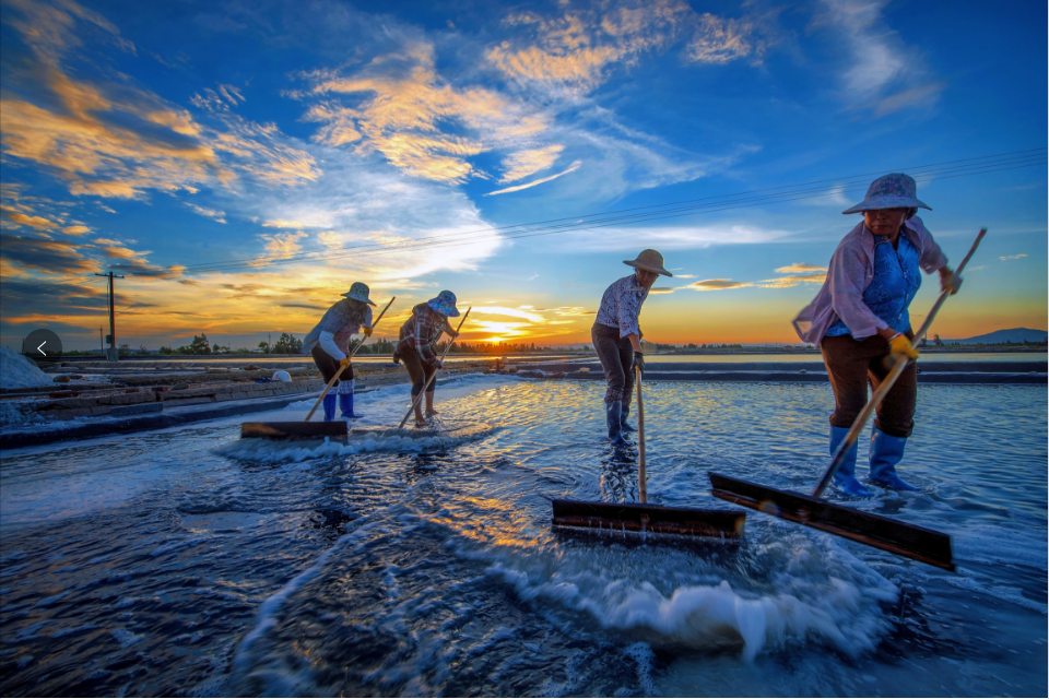 每年的7月至9月,是山腰鹽場的生產旺季。一線鹽工都是露天作業,頭頂烈日,腳踩在40多度的鹽池裏,來回忙碌著。扒鹽、旋鹽、篩鹽、收鹽,每一道工序都能讓人汗流浹背。曬鹽一半是海水,一半是汗水,曬得黑黝黝的臉龐,是鹽工的“標配”。