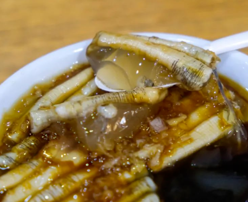 土筍凍裏當然也沒有“筍”了,仔細端詳,晶瑩剔透的“果凍”中間夾雜著的不是別的,而是一種,蟲子。