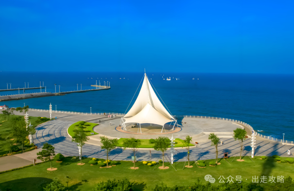 海濱休閑區由燈塔廣場、觀石廣場、觀濤廣場組成。沿海地段以燈塔、自然礁石群為主題,整合了護岸、木棧道、硬質鋪裝等帶狀景觀,並將大面積的綠化和水、石、亭等點狀、帶狀景觀有機組合,加之夜晚繁星般的燈火和白色張拉膜的映襯,使此地無不顯示日月同輝的景觀,形成了獨具特色的集人文、自然於一體的休閑旅遊環境。