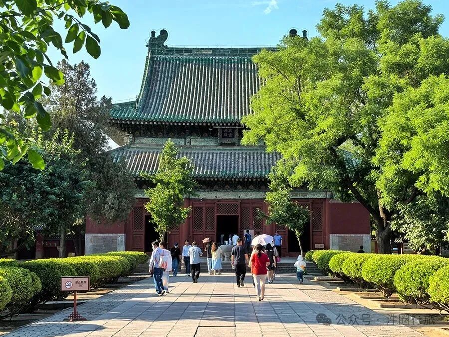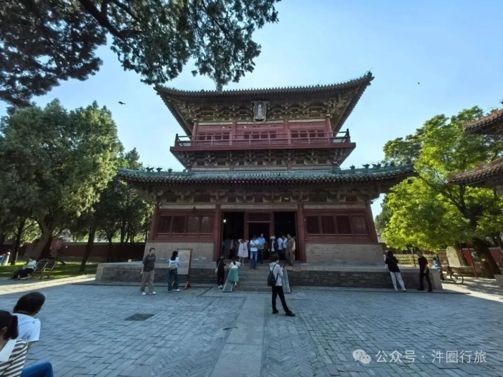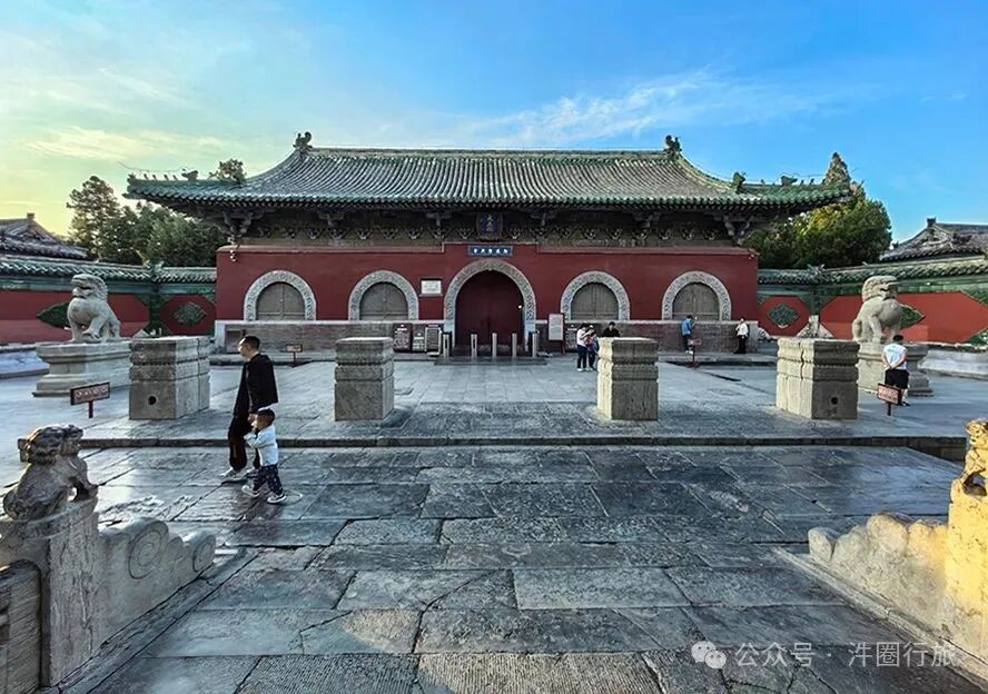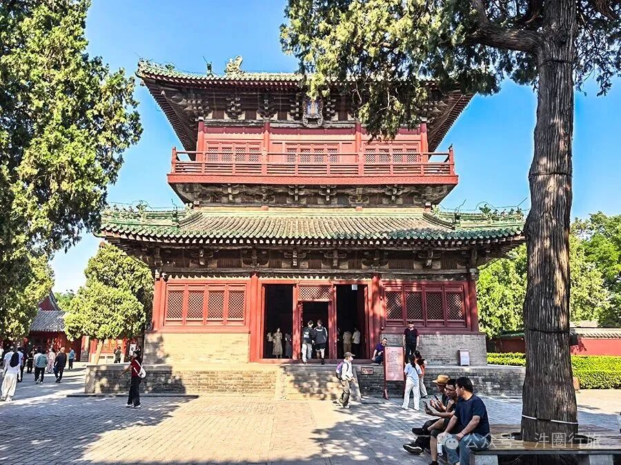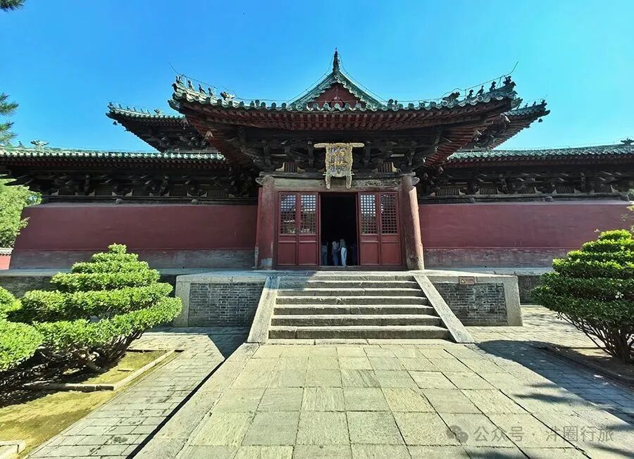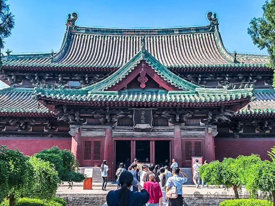跨過門口的三路單孔石橋,便是古樸低調的天王殿。 與摩尼殿的華麗十字形不同,天王殿為單簷歇山頂構造,脊殿坡度開展舒緩,傳遞出「宋式美學」的簡約之美。