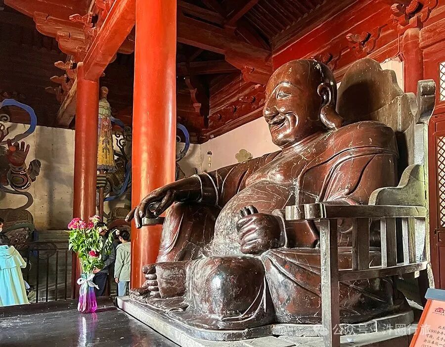殿內供奉的木雕大肚彌勒佛為金代遺物,距今已有800多年曆史。據說在佛祖肚臍處有一暗格,1987年修複時發現內藏北宋「祥符元寶」銅錢七枚,其含義是對應北鬥七星。