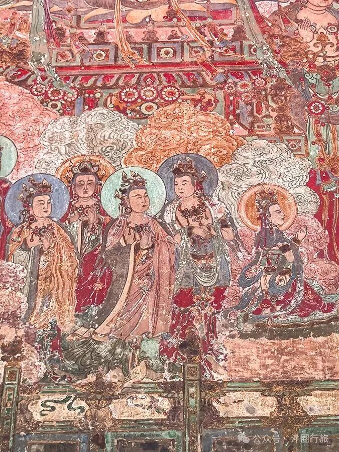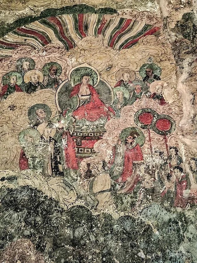 可惜大部分壁畫可能因保存關系剝落嚴重。比較完整的東面牆有一整幅大型的“西方勝景”壁畫。壁畫正中為西方三聖——彌陀、觀音、大勢至菩薩,共繪佛、菩薩、羅漢、樂伎、聖眾400餘身。以冷色(青綠)和暖色(朱紅)形成視覺上的對比沖擊,色彩曆經數百年仍鮮豔。