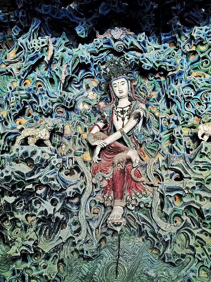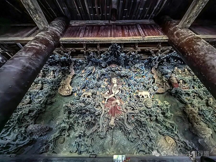 被魯迅先生譽為“東方美神”的“倒坐觀音”像五彩懸塑位於後壁懸山之上,堪稱中國佛教藝術中的曠世絕作,其獨特的姿態與神秘融合了宗教藝術與民間智慧的集大成。