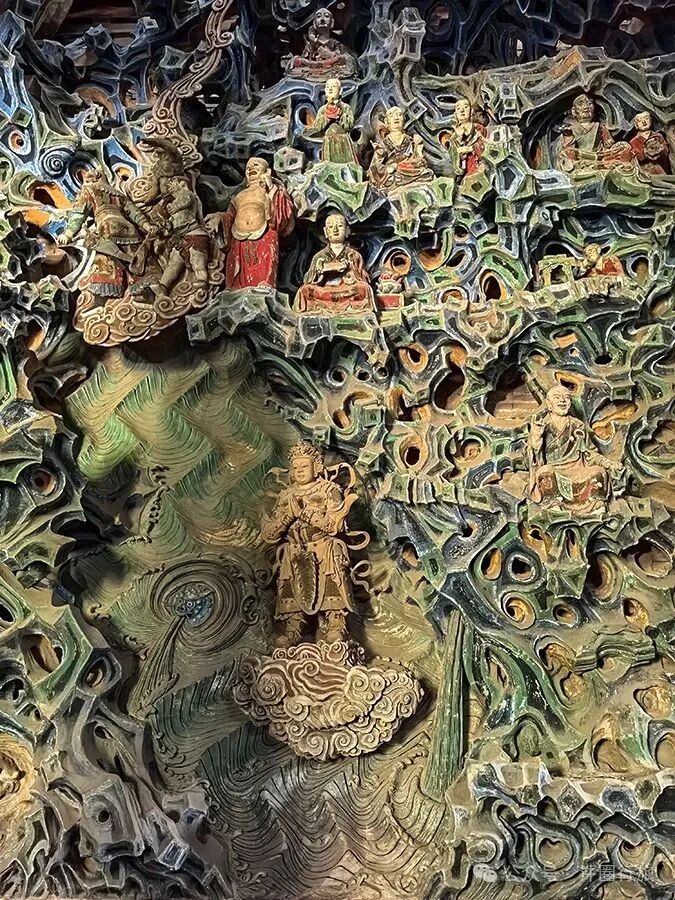 整片懸塑為觀音菩薩在“普陀洛迦山”道場的說法場景。背景是一片祥雲繚繞的山海仙境。踞中而座的觀音像一改寶相莊嚴之態,左足踏蓮,右膝屈起,手臂自然搭於膝上,薄紗衣裙飄逸,有種在隨風輕揚的即視感。主像的姿態閑適輕盈,面容恬靜含笑,眉眼低垂,似在傾聽眾生疾苦。