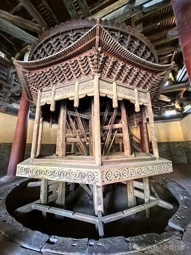 轉輪藏為一個形似二層樓閣重簷式建築,下簷八角形對應“八正道”。中央設一根柏木主軸貫穿上下,支撐整個轉輪藏結構。