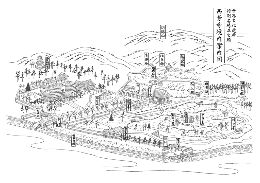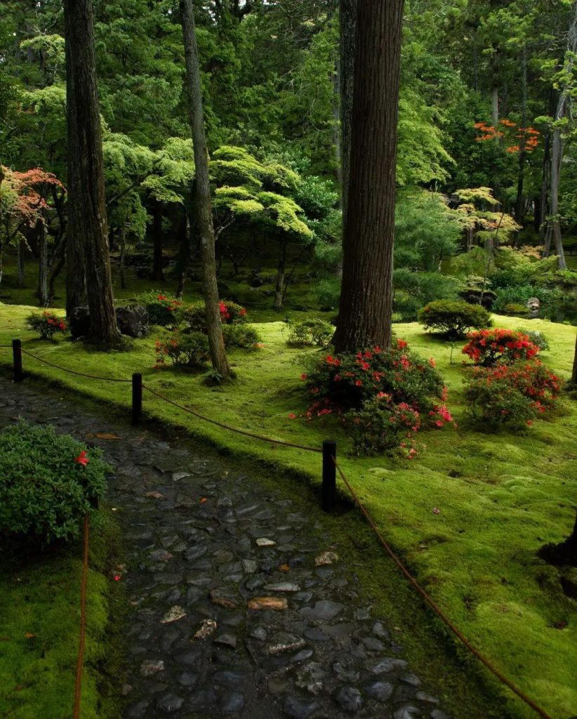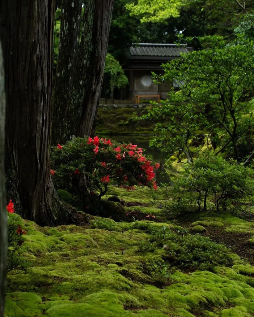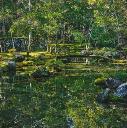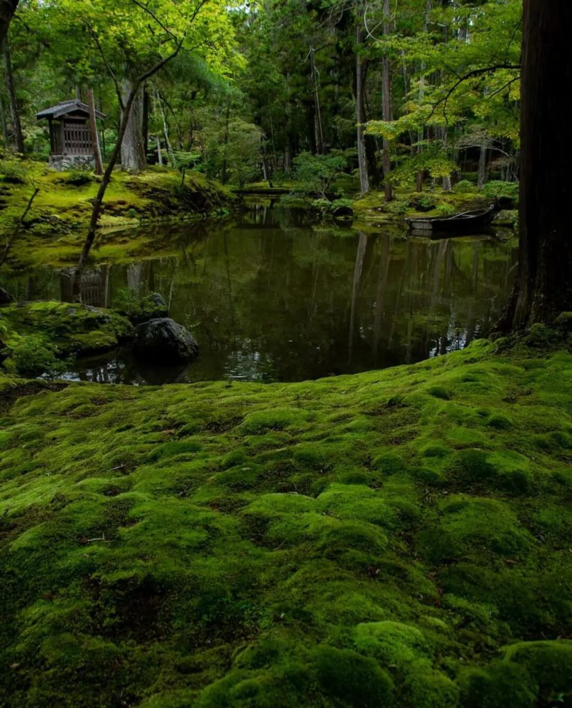 庭園中總計有超過120 種苔蘚,看起來綠意盎然,散發著鮮活但又靜謐的氣息。遊客在西芳寺可以一邊沿著水池散步,一邊欣賞風景。