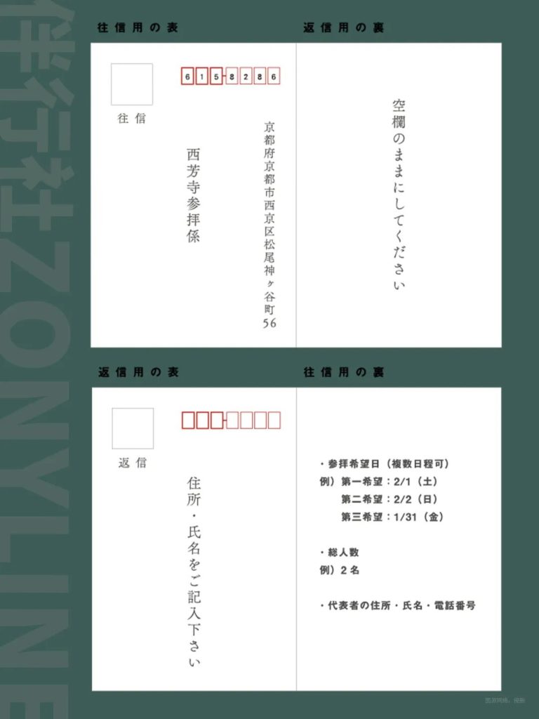 【往信】:左邊寫上西芳寺的地址,右邊請空白(因為右邊是西芳寺返信)。