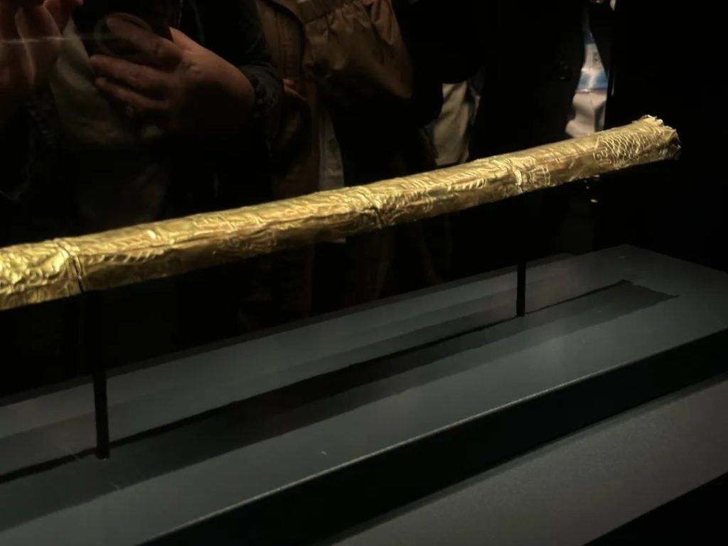 雖然叫黃金權杖,但它並不是通體都用黃金制成。而是用金皮裹著木杖,當初複原時,木頭都已經壞掉了。透過玻璃湊近看,你可以發現金皮上面刻著魚、鳥、箭等圖案,線條非常流暢。