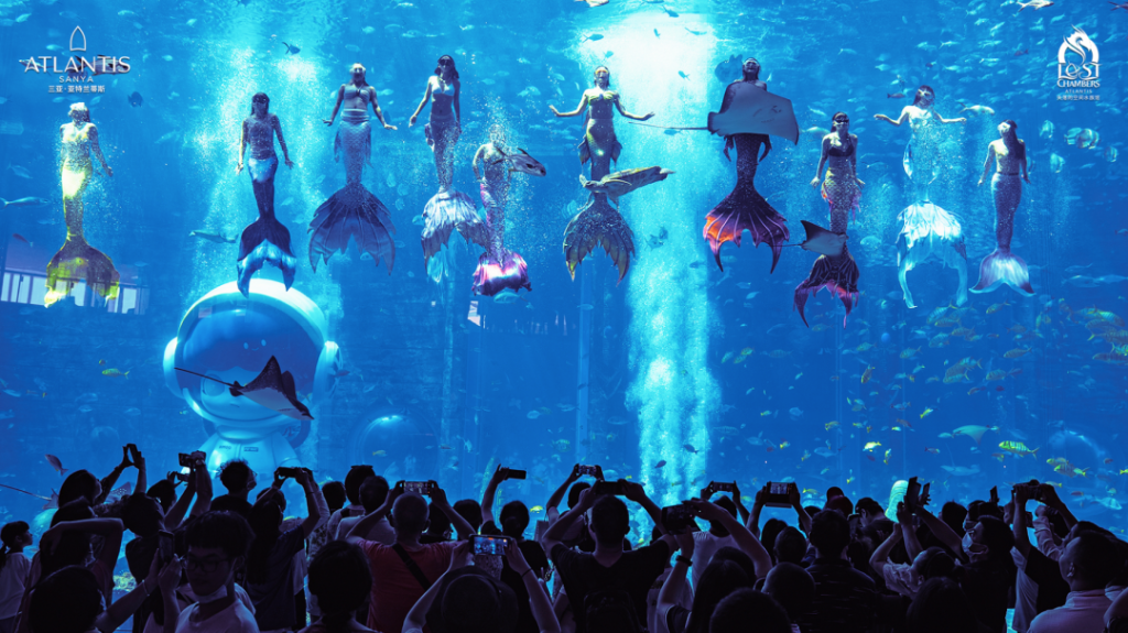 作為我國唯一擁有天然海水海洋生物棲息地的酒店,這裏有亞洲首個夜間水上燈光秀——亞特蘭蒂斯之夜,我國首個海洋主題沉浸式演出——C秀(劇場中央設2000噸移動水池,技術難度亞洲領先)。