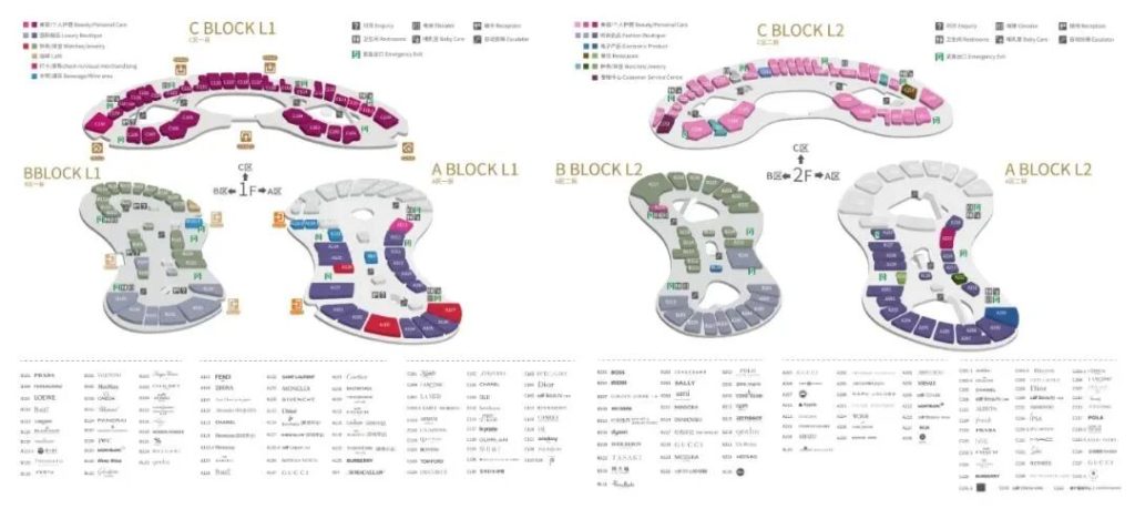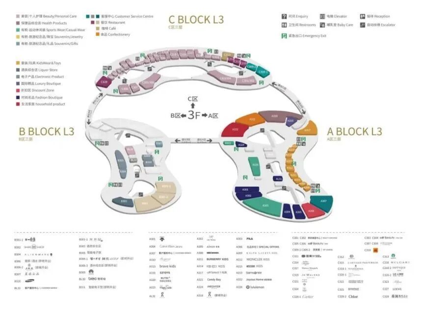 由ABC三棟商場組成,各區域品牌分布大致如下:
