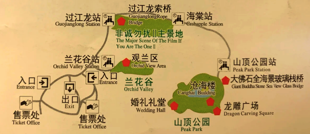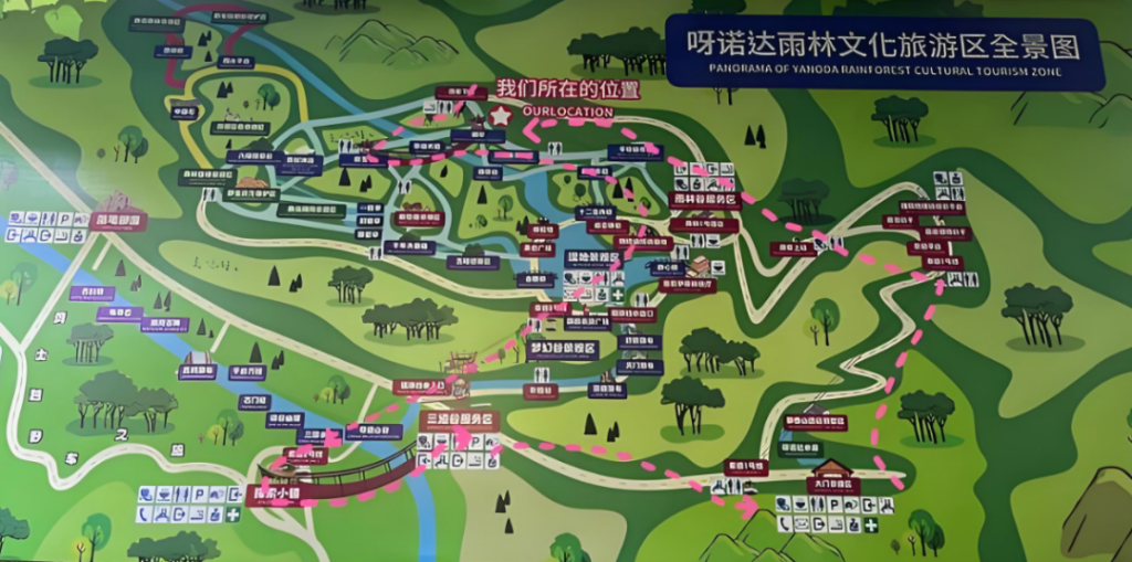 遊客中心 → 夢幻穀 → 濕地景觀區 → 呀諾達熱帶雨林餐廳 → 雨林穀。