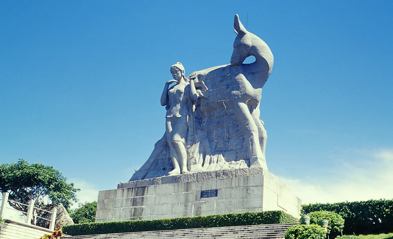15米高花崗岩雕塑,再現黎族青年與坡鹿少女相遇場景。