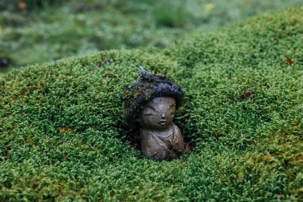清新的雨中,微笑的稻草地藏埋藏在苔蘚中,與大地已經融為一體。