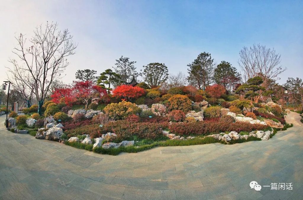 秋江落照位於園林北山區域,景象以秋色葉自然山林和一覽亭為特色。一覽亭地處北山最高點,亭名喚作“一覽亭”——高境界而振精神。亭內北望可見黃浦江,南望可見園內湖面及中心湖,秋季日落時分是亭內賞景的最佳時間。