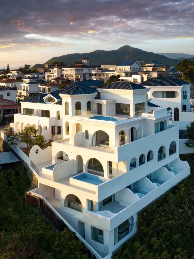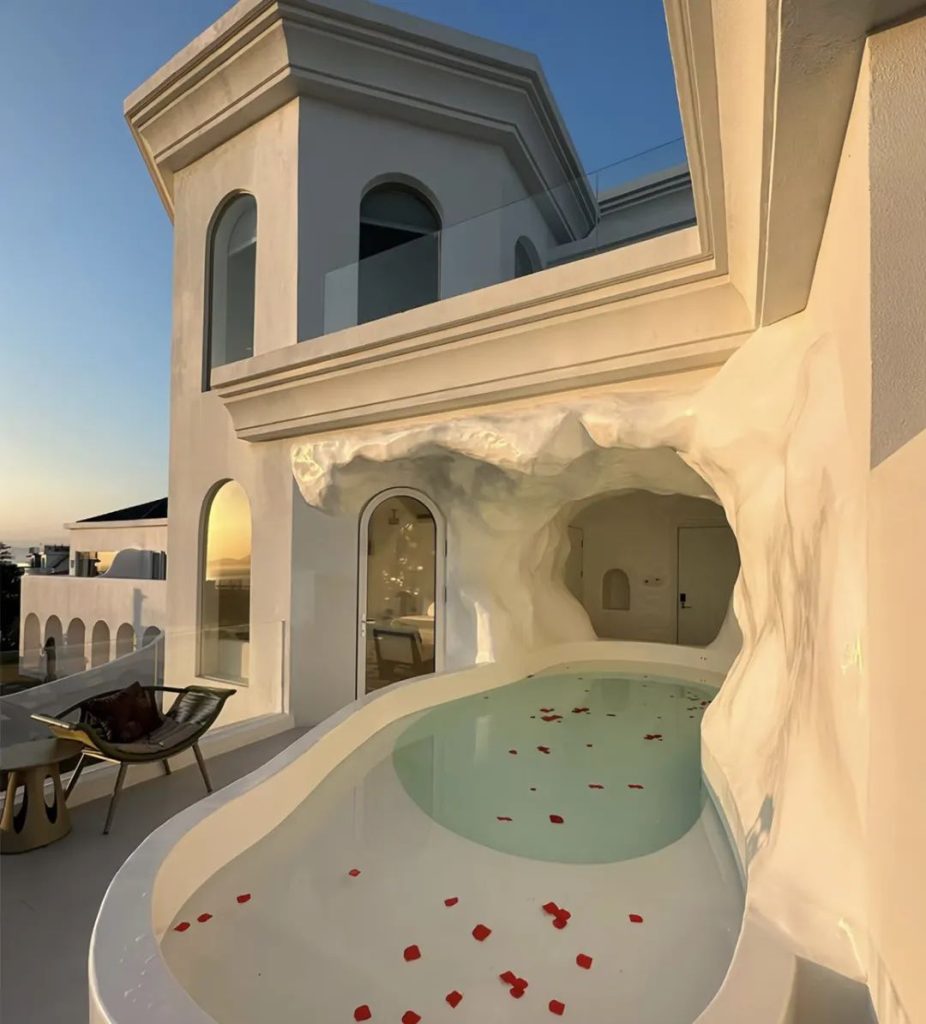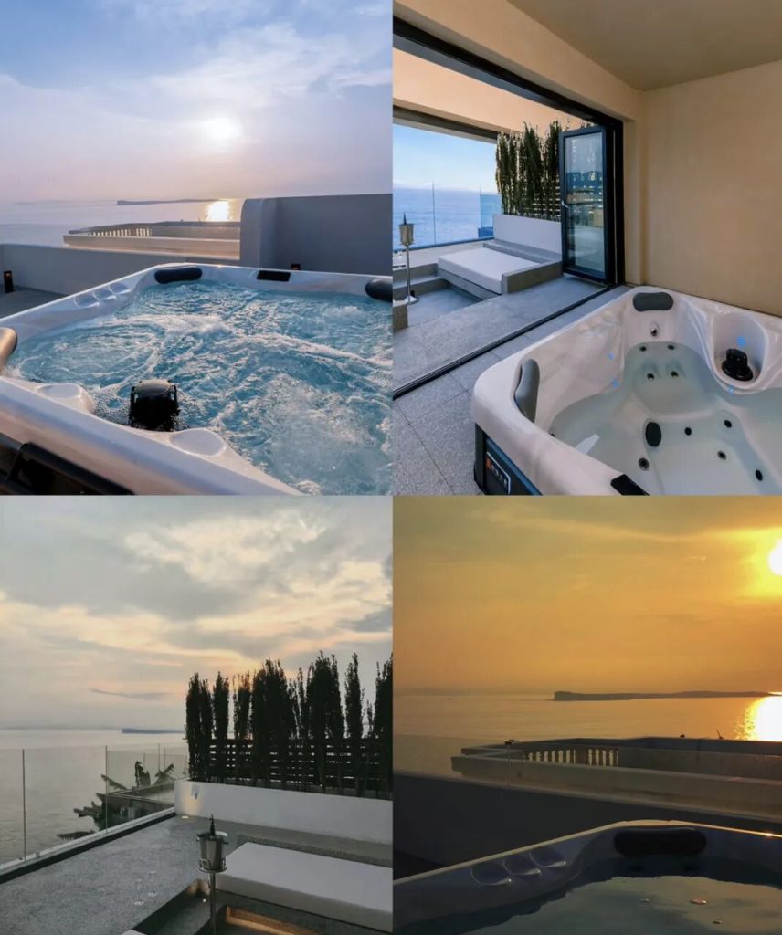 這家民宿簡直是夢幻的代名詞!藍瓦白牆的建築循山勢層層錯落分布,矗立在懸崖之上,與自然美景渾然相融。在這裏,你可以在泡池裏一邊享受著溫暖的水,一邊欣賞著無邊的海景;也可以坐在房間裏,靜靜地感受著海風的吹拂,看著窗外的落日餘暉。每一間房都有著獨特的設計和風景,讓你仿佛置身於浪漫的聖托裏尼。