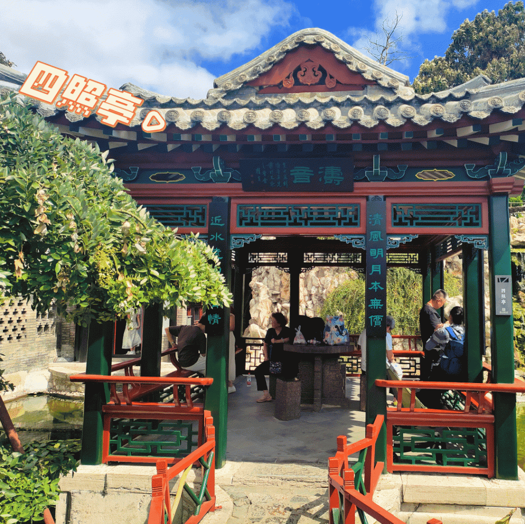 四照亭:沉靜地端坐水中,因可東觀山亭,西觀遊廊,北賞硯香樓,南眺十笏草堂四面風景而得名。