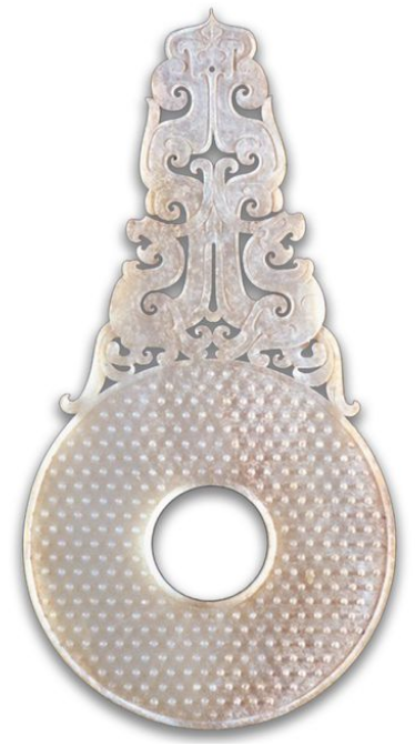 玉質潔白晶瑩,璧的兩面琢刻穀紋,上端有透雕雙龍卷雲紋附飾。紋樣優美,造型生動,是漢代玉器中的珍品。