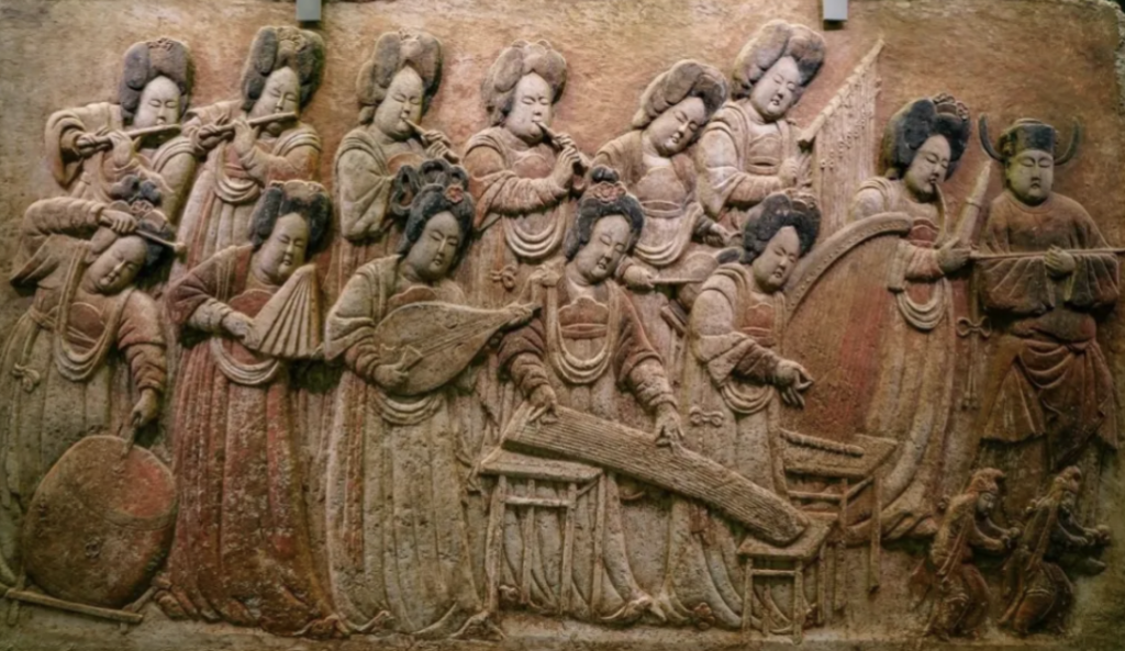 長1.36米,高0.82米,原嵌於墓室西壁南部下方,畫面由15人組成,伎樂人物豐滿圓潤,表情生動,浮雕以漢白玉精雕細刻而成,線條唯美流暢,姿態生動,可謂上承大唐之餘韻,下啟宋遼墓葬壁畫散樂圖像之先聲。
