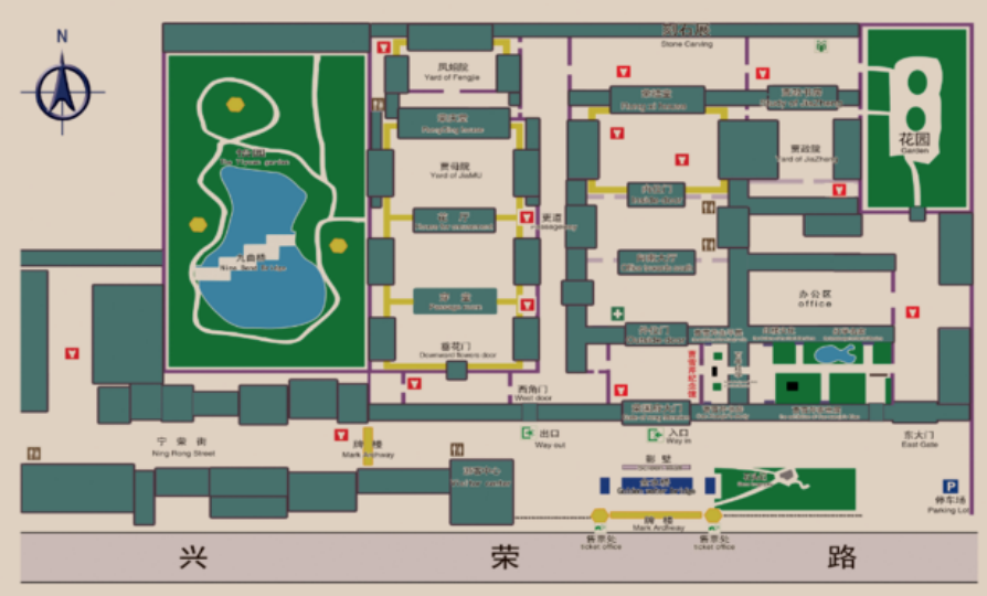 榮國府大門赫然寫著“敕造榮國府”,府中有房間212間,遊廊102間,整個府邸分東、中、西三路,各路均為明清五進四合院。